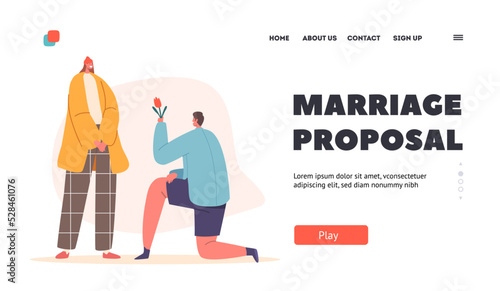 Marriage Proposal, Love, Relation Landing Page Template. Boyfriend Standing on Knee Giving Flower to Cute Surprised Girl