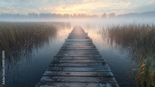 Marsh cattails surrounding wooden boardwalk leading across foggy wetland waters with dramatic sunrise sky and fall foliage