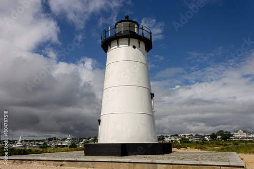 Martha's Vineyard, Massachusetts. The Edgartown Harbor Lighthouse, white tower with a black lantern, rises from sand and marsh, framed by dunes against a clear blue sky