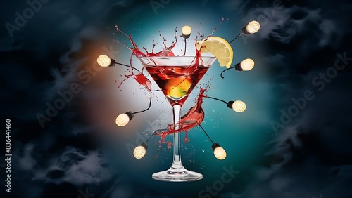 Martini cocktail glass splashing on dark toned smoky background or colorful cocktail in glass with splashes and lemon party club entertainment mixed light selective focus