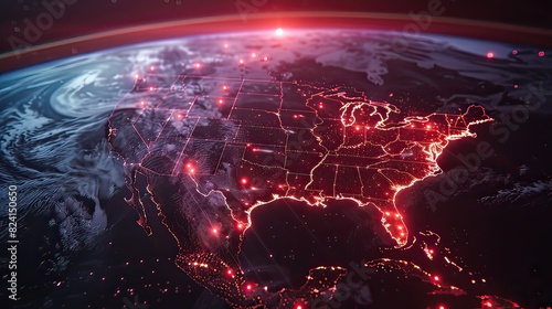 Marvel at this abstract view of North America from space, showcasing vibrant red fiber optic cables emerging from major cities, symbolizing digital connectivity and modern infrastructure.