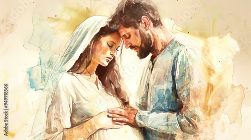 Mary and Joseph share a gentle moment, gazing down at Mary's belly, filled with love and anticipation for their soon-to-be-born son