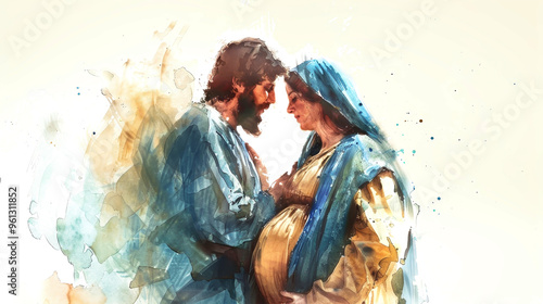 Mary lovingly holds her pregnant belly, while Joseph embraces her; their shared gaze reflects excitement and warmth before embarking on their journey