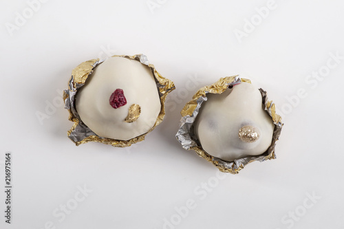 Marzipan sweets on white background, top view