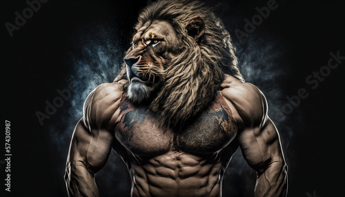 Masculine and very muscular lion-man. Testosterone concept. Gym wallpaper. Generative AI.