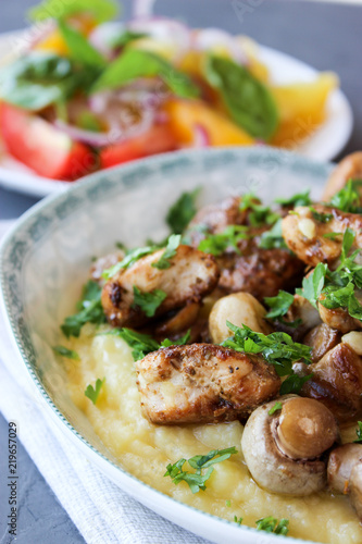 mashed potatoes with fried mushrooms and chicken on a side dish with tomatoes.