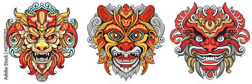 Mask design in traditional balinese motifs, indian mask, colorful cartoon, dynamic and exaggerated facial expressions on white background. Generative ai.