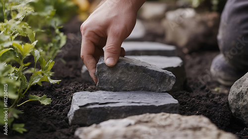 Mason building a stone path in a backyard garden. Featuring landscaping and stonework
