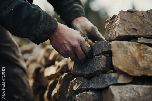 Mason building a stone wall for garden. Featuring masonry and landscaping work