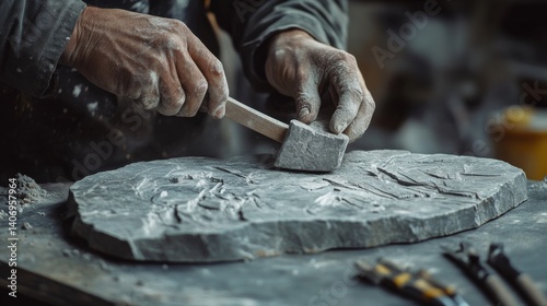 Mason chiseling stone for a sculpture. Featuring stone carving