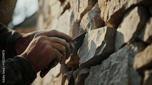 Mason chiseling stone for wall construction. Featuring precision and craftsmanship