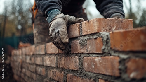Mason constructing a brick wall for an outdoor garden. Featuring bricklaying