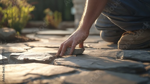 Mason creating a stone patio for outdoor entertainment. Featuring craftsmanship and design