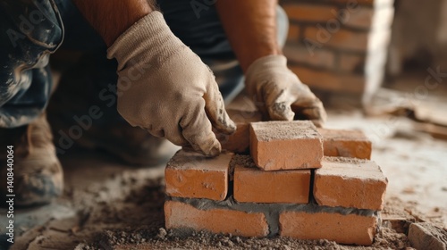 Mason laying bricks for a fireplace in a living room. Featuring craftsmanship and technique