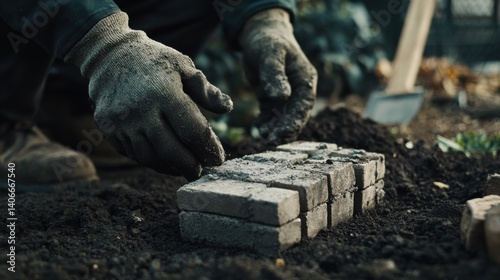 Mason laying bricks for a garden wall in a suburban backyard. Featuring masonry skills and landscape design