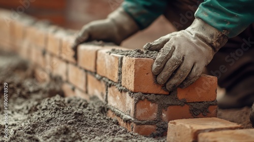 Mason laying bricks for a garden wall with precise alignment. Featuring craftsmanship and durability