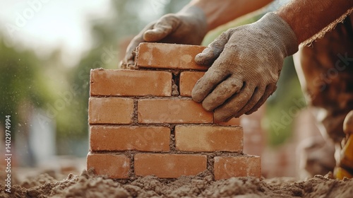 Mason laying bricks for a new structure. Featuring craftsmanship and construction