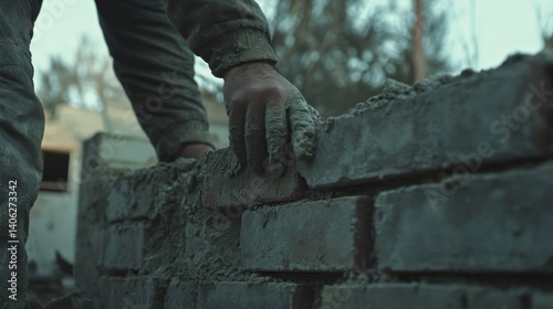 Mason laying bricks on a wall at a construction site. Featuring masonry skills
