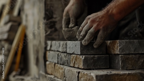 Mason laying stone bricks for a fireplace. Featuring skill and design