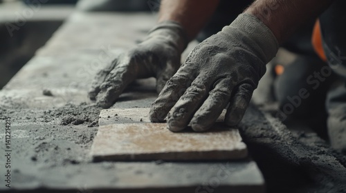 Mason laying stones for a building foundation. Featuring focus and technique