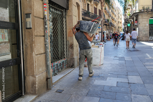 Mason Working in the Street while People Walk by and Lifting a Big Bucket in his Shoulder