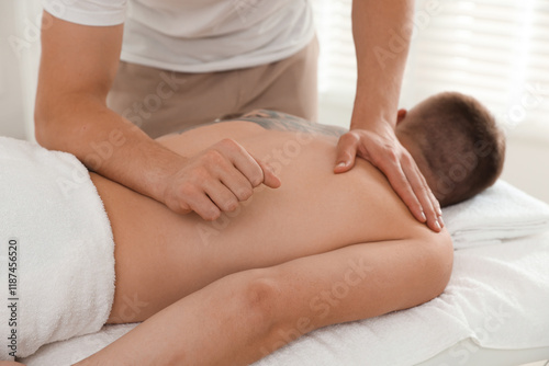 Massage therapist working with patient in clinic, closeup