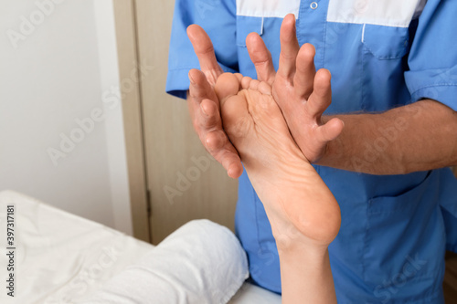 masseur dressed in uniform makes foot massage to his client in spa parlor. sequence of elements of wellness massage and body relaxation. Concept of healthcare and medicine.