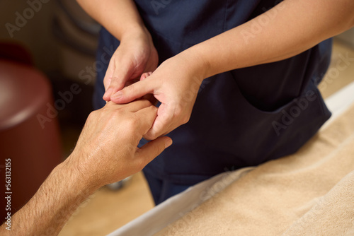 Masseuse in aesthetic medicine clinic kneads the fingers of patient