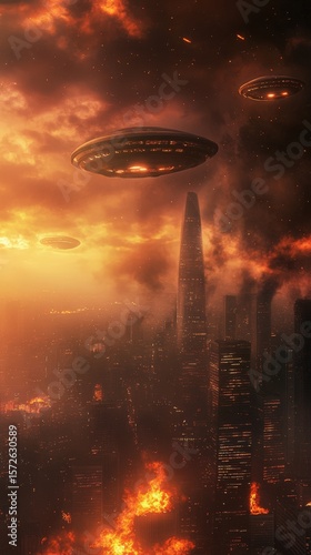 Massive alien vessels bombarding devastated futuristic metropolis, unleashing fiery explosions and widespread urban destruction during catastrophic invasion scenario