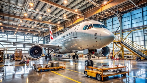 Massive commercial airliner undergoes thorough maintenance in vast aerospace hangar with engines and fuselage stripped for detailed inspection and repair.