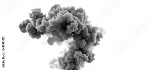 Massive dark gray smoke plume billowing against stark white background, chimney, catastrophe