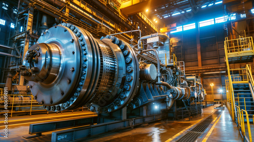 Massive industrial turbine inside a factory with complex engineering and numerous metal parts.