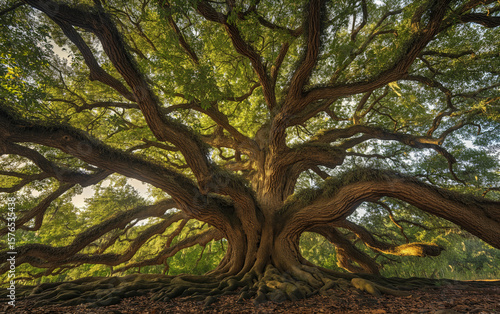 Massive oak tree with sprawling branches and exposed roots, showing nature's strength. Old forest full of foliage and sunshine for travel.