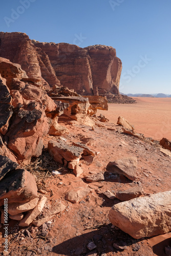 Massive sandstone cliff rising above a desert plain under clear blue sky. Arid rocky landscape with striking geological formations and warm red tones.