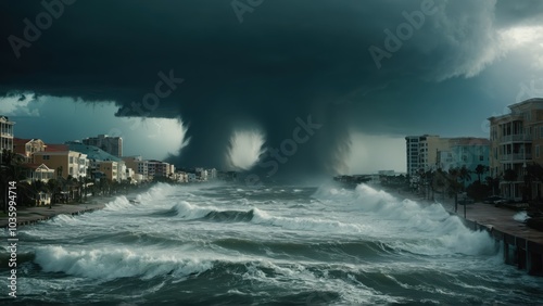 Massive tornado approaching coastal city, threatening destruction of coastal buildings.