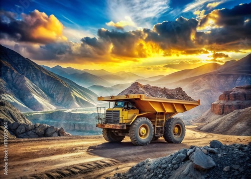 Massive Yellow Dump Truck in Open Pit Mine: A Double Exposure Capturing Heavy Machinery Amidst Rugged Landscape Highlighting Scale of Mining Operations