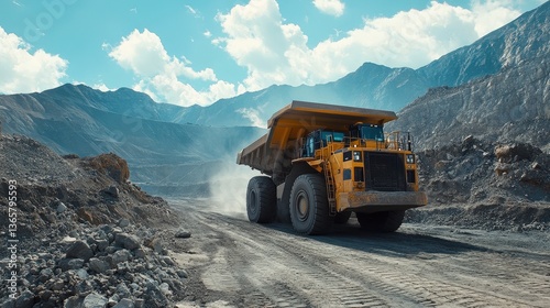 Massive yellow dump truck navigates rugged terrain under a bright sky, showcasing industrial power in action Generative AI