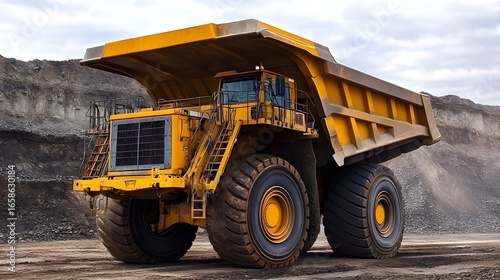 Massive yellow dump truck parked on a construction site with rocky terrain and cloudy sky backdrop