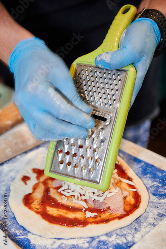 Master Class of making Pizza. Pizola grates cheese. Close-up, selective focus