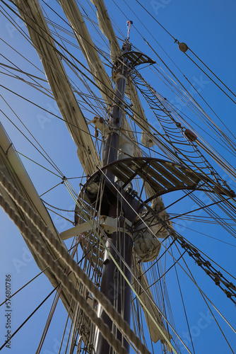 Masts, ropes, sails, ladder and hauled in sails of a historic sailing ship with a blue sky