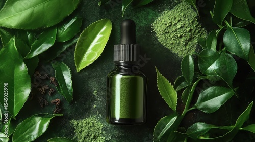 Matcha Green Tea Extract with Leaves and Powders on Dark Background