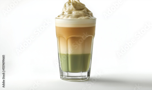 Matcha Iced Latte with Creamy Top in Clear Glass on White Background