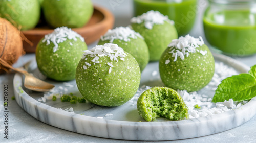 Matcha lover, A photorealistic image of matcha energy balls, showcasing high fidelity and intricate details, ideal for food-related content and marketing.