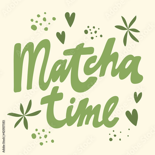 Matcha time. Vector hand drawn matcha illustration on contrast background. Cake, macaroons, spoon, bamboo whisk, heart, matcha tea