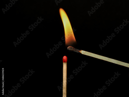 Matches on fire with a flame on a black background