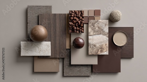 Material palette featuring various wood, stone, and paint samples in warm tones