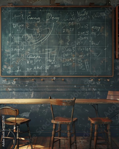 Math equations on chalkboard, dim classroom light, eyelevel, challenging problemsolving , hyper realistic