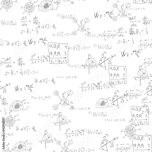 Mathematical scientific formulas and expressions. Educational, school and university background. Seamless pattern. Hand-drawn vector on white.