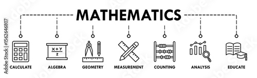 Mathematics banner icons set with icon of calculate, algebra, geometry, measurement, counting, analysis and educate
