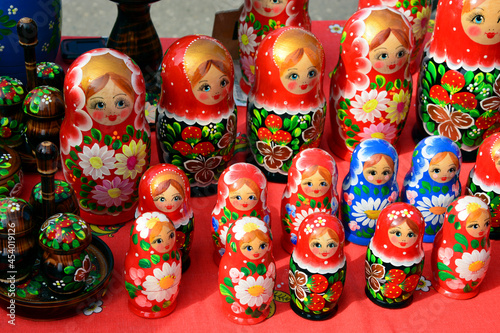Matryoshka. Toys of the Slavic people, folk dolls matryoshka are sold in the market.